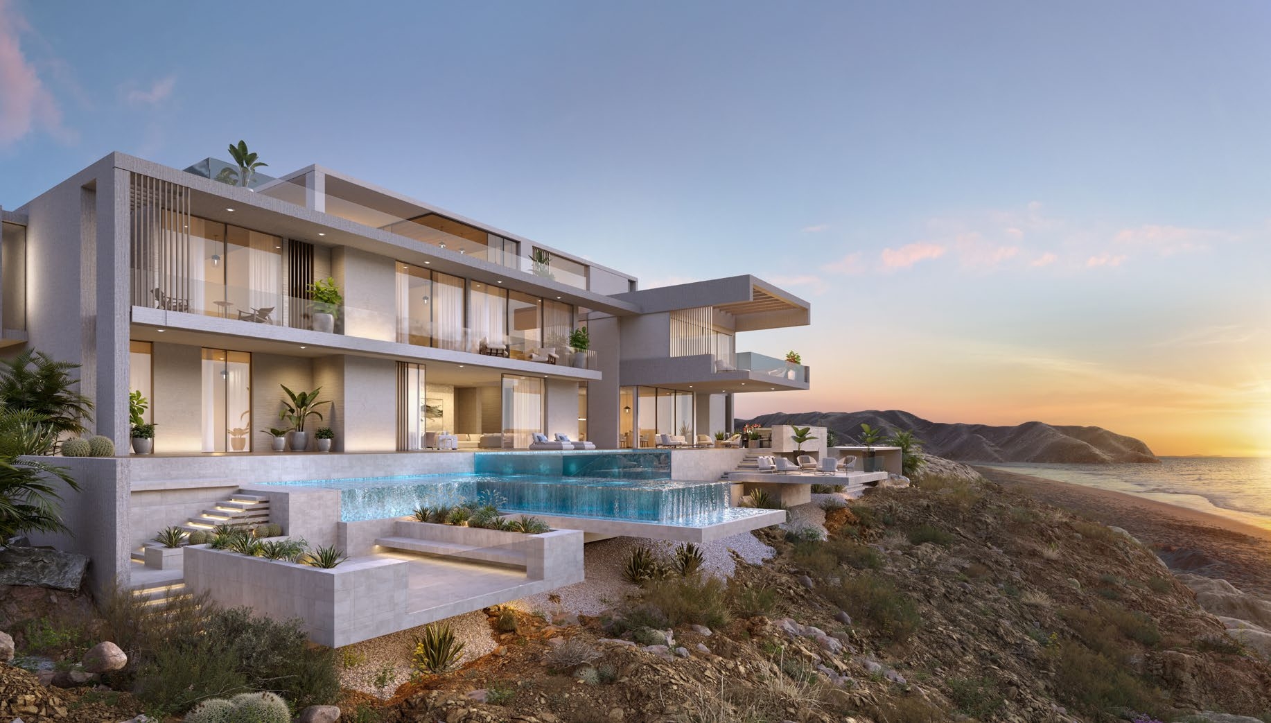 This property is beautifully designed by the natural architecture of the mountains and ocean that surround it from everywhere. These villas sit on top of a cliff, 130 meters above the Gulf of Oman and surrounded by a golf course and green spaces.