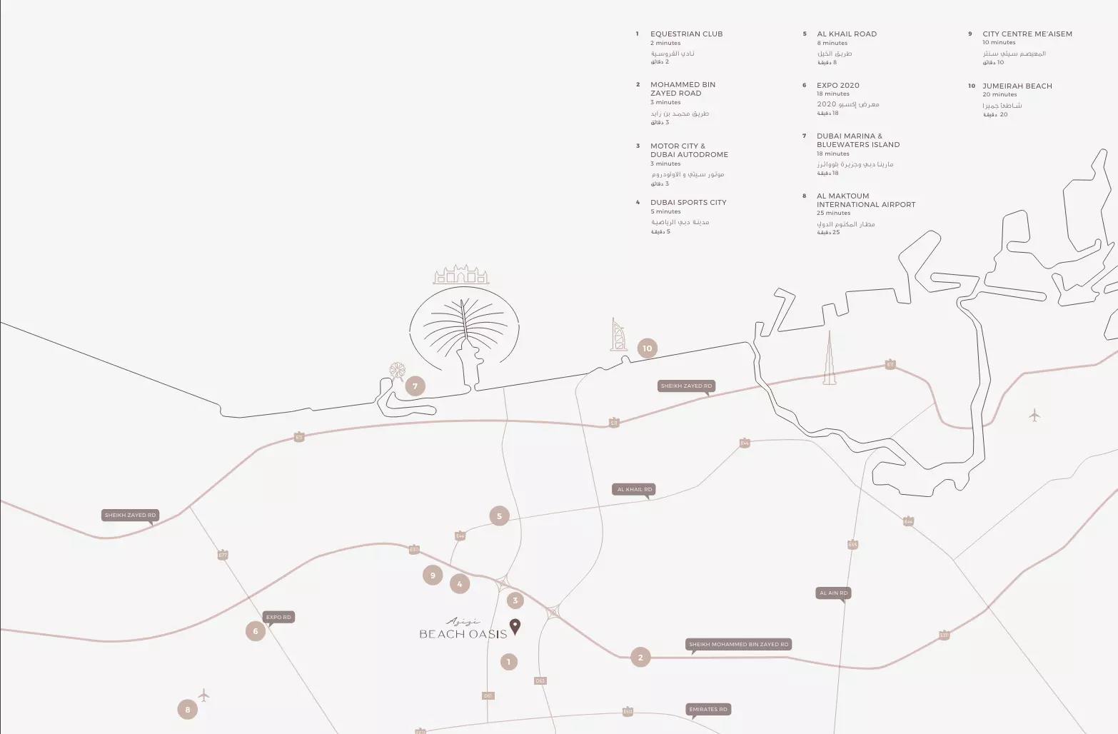 Azizi Beach Oasis, nestled in an ideal location, caters to all your lifestyle needs. From basic requirements to luxury demands, the property's location offers it all. Plus, the accessibility it provides makes it the perfect place to reside.