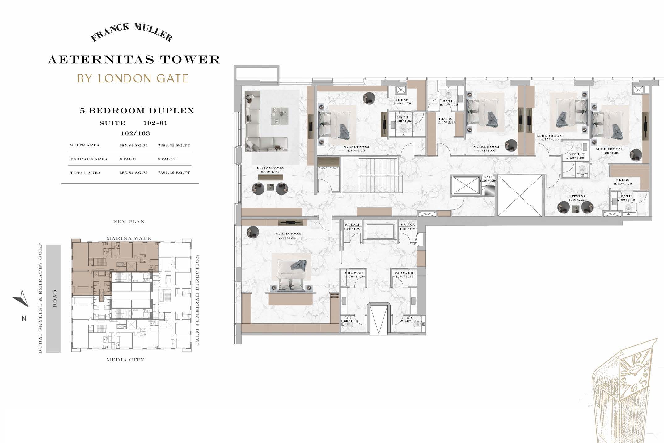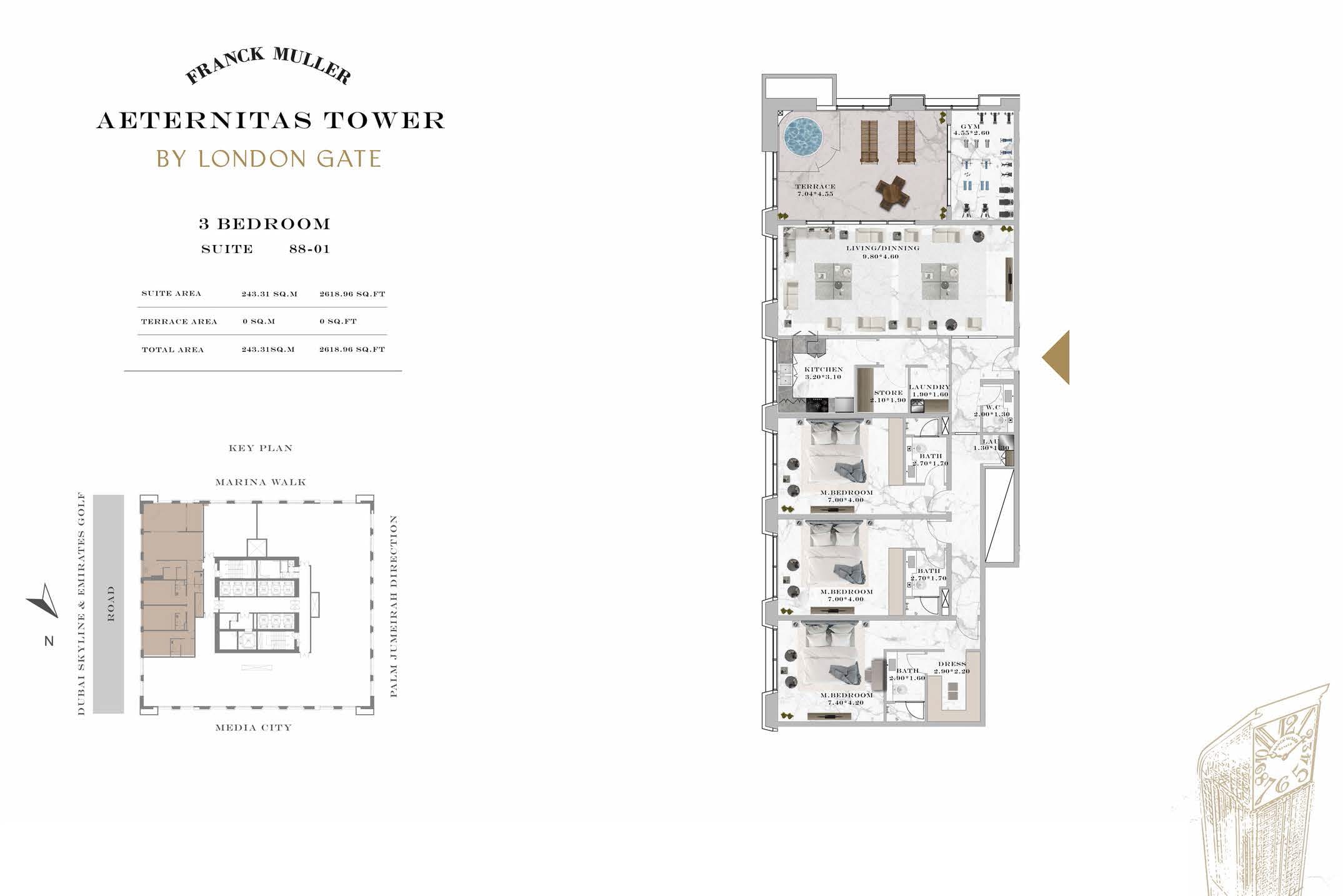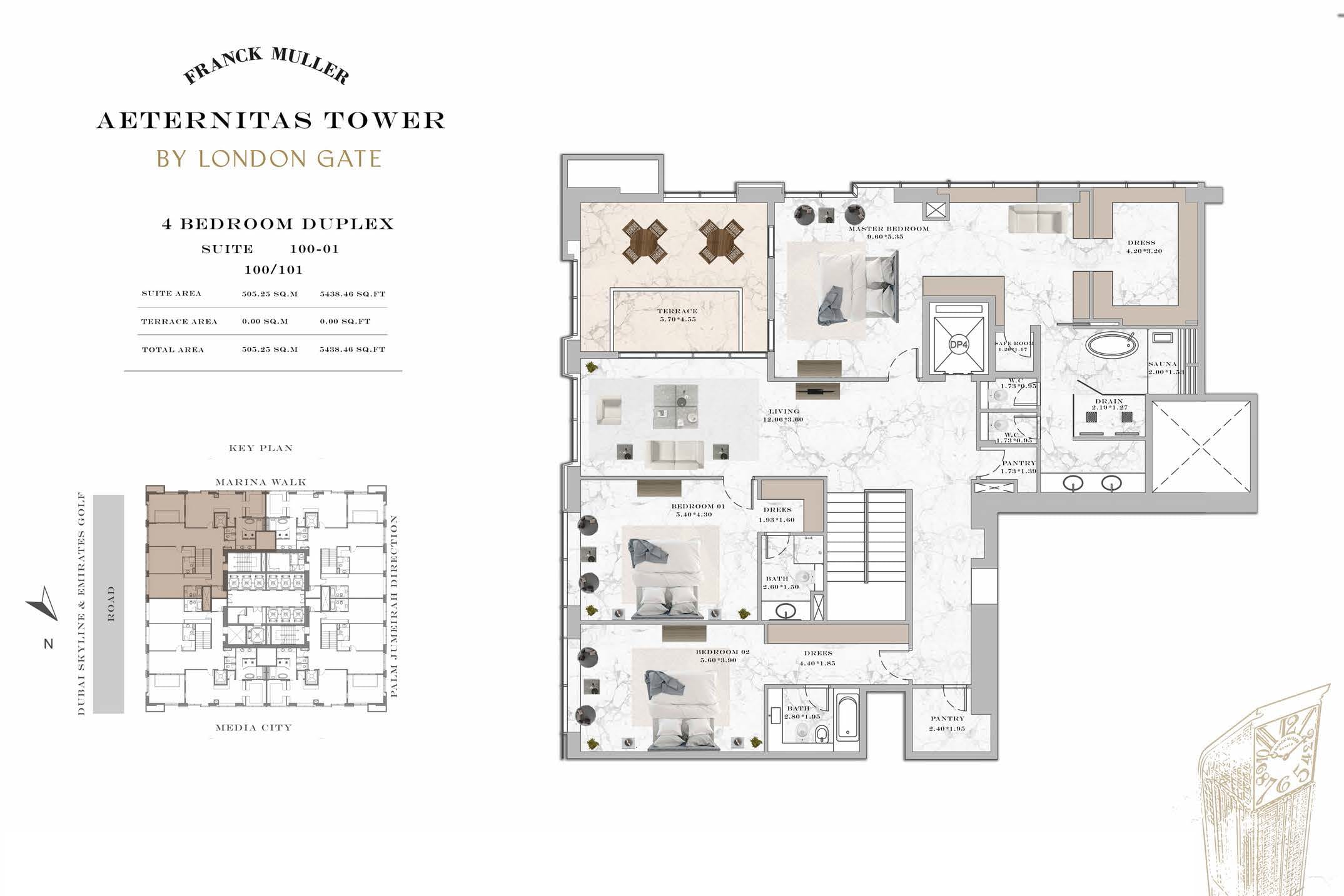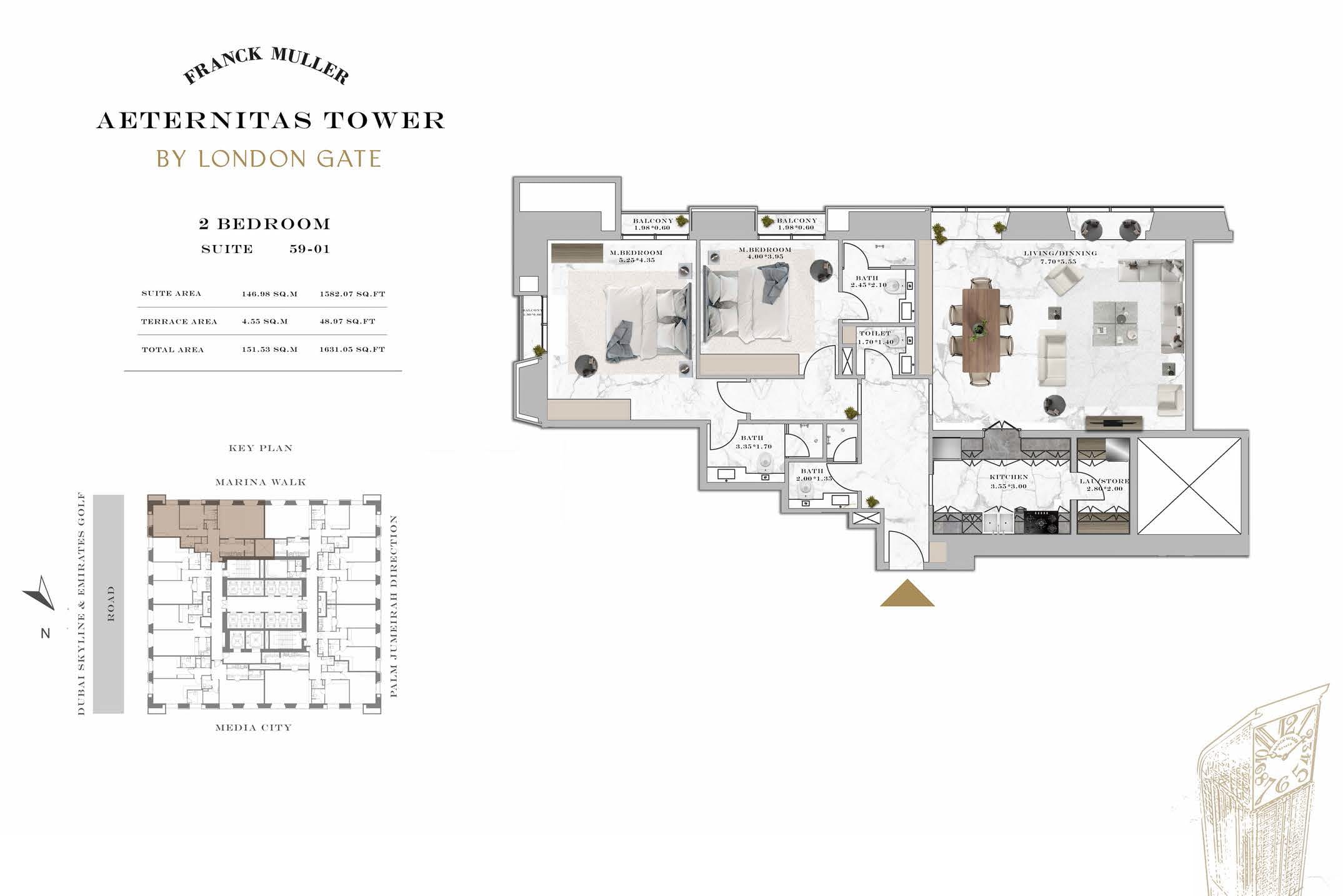 Franck Muller Aeternitas Tower at Dubai Marina is the first tallest clock tower in the world developed by London Gate with branded 1 to 3-bedroom apartments and duplexes. With impressive height of 450 meters, it is the tallest branded residential tower. The tower's unique design, characterized by an angular structure and a captivating clock displaying numbers in various sizes, promises to redefine the Dubai skyline. This collaboration marks debut in real estate, a testament to the brand's commitment to innovation and excellence.