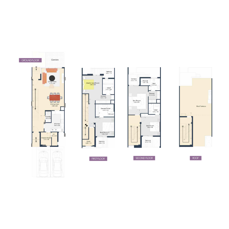 Lilac Park presents a distinctive collection of 4-bedroom townhouses, each meticulously designed to elevate your living experience. The ground floor seamlessly integrates the living, dining, and family rooms, accompanied by a well-appointed kitchen, a spacious terrace, and parking spaces for two cars. The first and second floors host four bedrooms, complemented by en-suite facilities, while an additional maid's room with a bathroom adds to the convenience. Adding a touch of greenery to urban living, each townhouse features a rooftop garden, providing a private oasis in the heart of Lilac Park. Welcome to a harmonious blend of modern living and serene green spaces