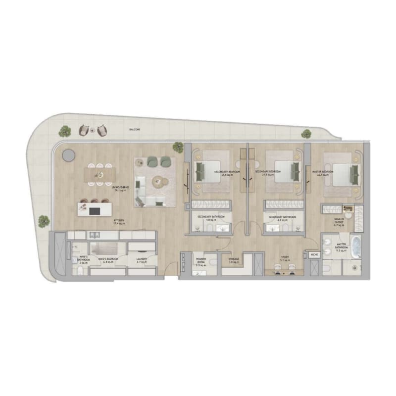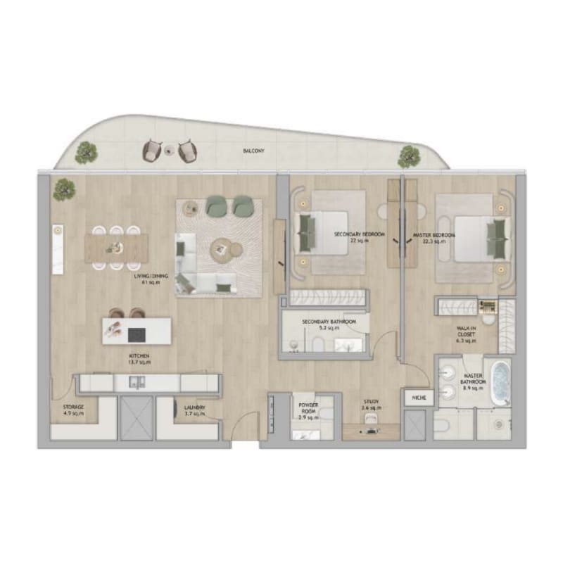 lifestyles, including one- to three-bedroom apartments as well as two- and three-bedroom townhouses. Residents can enjoy the convenience of living just minutes away from iconic landmarks like the Louvre Abu Dhabi and the upcoming Guggenheim Museum. With a focus on contemporary design and nature-inspired aesthetics, each unit is crafted to provide both comfort and elegance, appealing to those who appreciate a refined, tranquil living environment. The project promises an exclusive and serene residential experience amidst Saadiyat's rich cultural landscape.