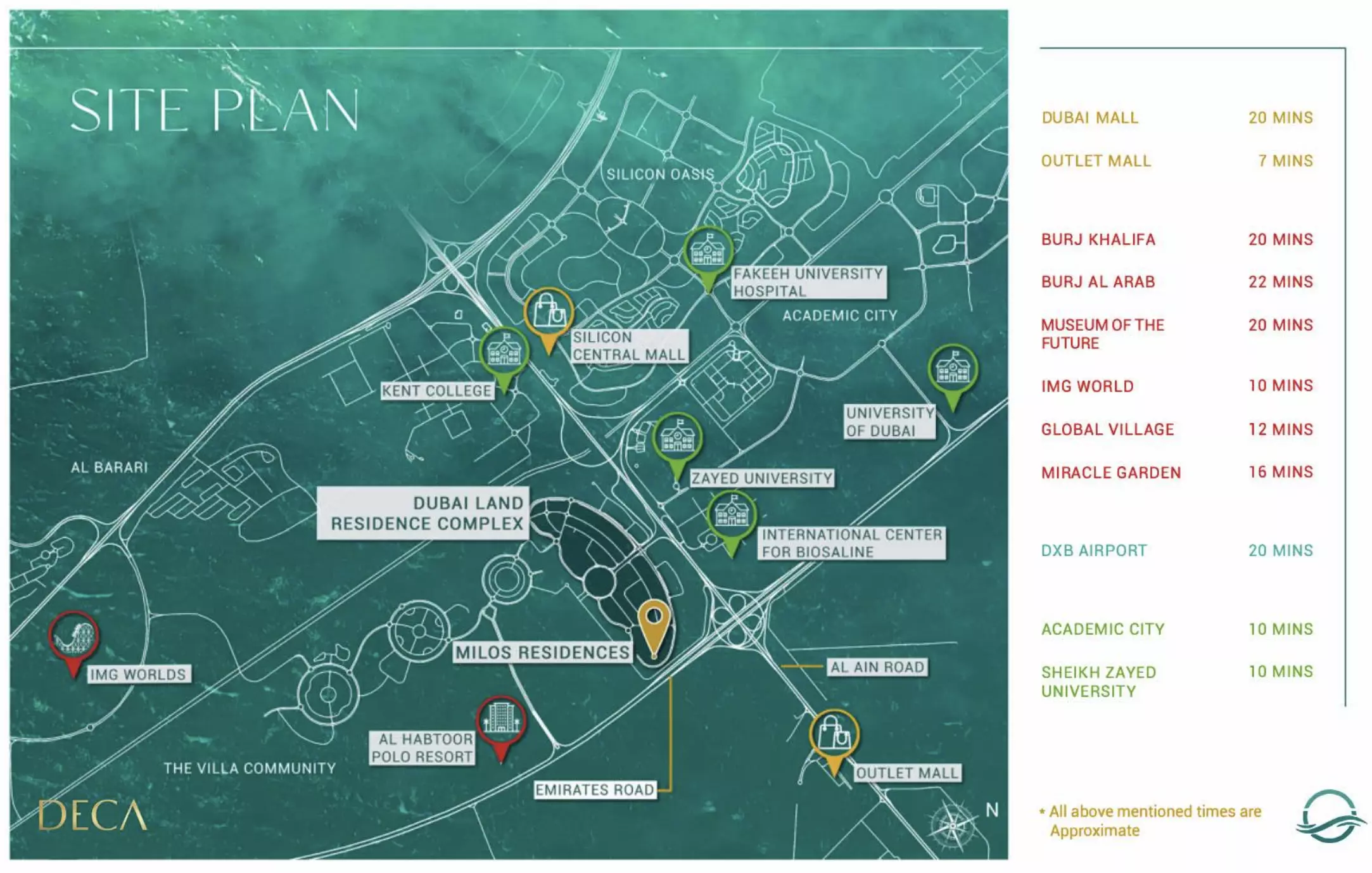 Milos by Karma has a prime location within the DubaiLand Residence Complex. This area is well-known for its excellent connectivity and access to a wide range of amenities. The proximity of major roads such as Sheikh Mohammed Bin Zayed Road and Al Khail Road ensures that residents can easily access other parts of Dubai.
