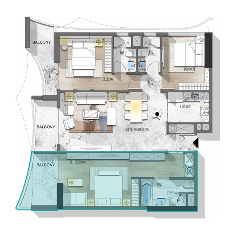 The design of the building emphasizes modernity and flexibility. Select 2-bedroom and 3-bedroom apartments are configured to allow separation into independent living spaces, such as a 1-bedroom and studio, or a 2-bedroom and studio. This modular approach allows for adaptable use of space, catering to diverse residential needs while maintaining a cohesive design language throughout the project.